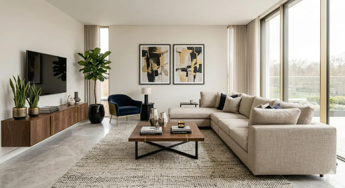 Salon moderne minimaliste avec décoration épurée et objets design discrets